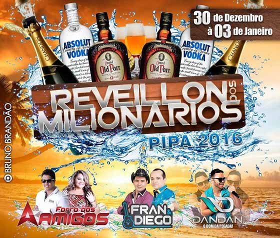 O Réveillon dos Milionários acontece na badalada Praia de Pipa, no Rio Grande do Norte, e é considerada uma das melhores opções de festas da região. A proposta do evento é que o público divirta-se de modo estendido e não somente durante a virada do ano, assim a festa acontece durante 05 dias seguidos.