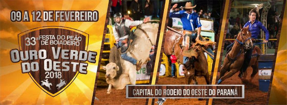 Realização da Associação de Rodeio e Eventos de Ouro Verde, o rodeio acontece em Ouro Verde de 09 a 12 de fevereiro, no Parque de Exposições.