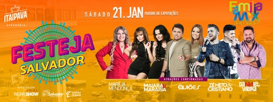 Salvador receberá grandes nomes da música sertaneja em janeiro. O Festeja Salvador 2017 foi confirmado e já conta com atrações divulgadas.